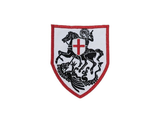 St George and the Dragon, Black and White with Red Border, Badge, Patch, England patron saint, Medieval icon, National flag emblem, Barcelona and Catalonia, Shield