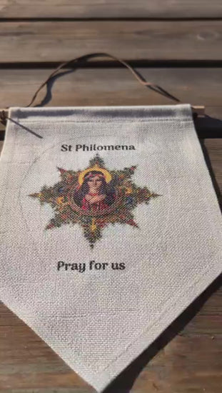 This beautiful religious Catholic banner features St Philomena - is perfect for any religious setting. This mini banner also makes a wonderful sacramental, devotional, pilgrimages or rosary wall hanging. Printed in the UK using quality materials this mini banner is suitable for indoor and outdoor use.
